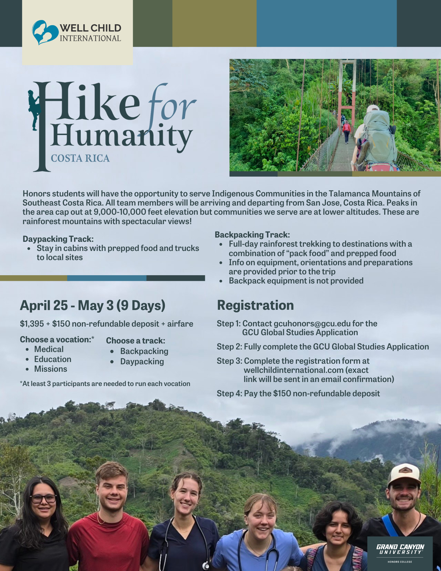 The Honors College at Grand Canyon University (GCU) is comprised of the top tier students, grade wise, at GCU. Honors College provides additional opportunities for Honors Students to enhance and further their learning experiences as well as prepare them for acceptances at top level graduate schools. Well Child International (WCI) has been partnering with GCU for 12 years to provide unique, first-class international learning and serving opportunities. The WCI Honors College programs for pre-health students, for example, are unique study abroad opportunities providing a very effective “rounding out” of students’ service/learning experiences and, also, a key “resume builder”.
